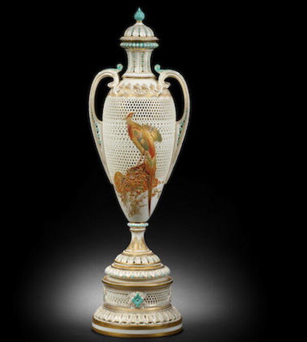 Сетчатая фарфоровая ваза работы Джорджа Оуэна, расписанная Гэри Чеаром, высота 21 см, Royal Worcester, 1898 г.