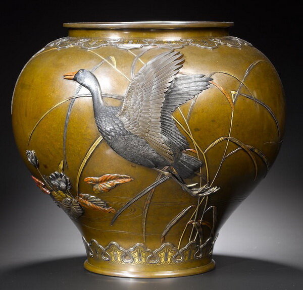 Бронзовая ваза с изображением гуся в полете, инкрустированная серебром, золотом и патинирующими металлами, высота 26,7 см, мастер Сузуки Чёкичи, конец XIX века.